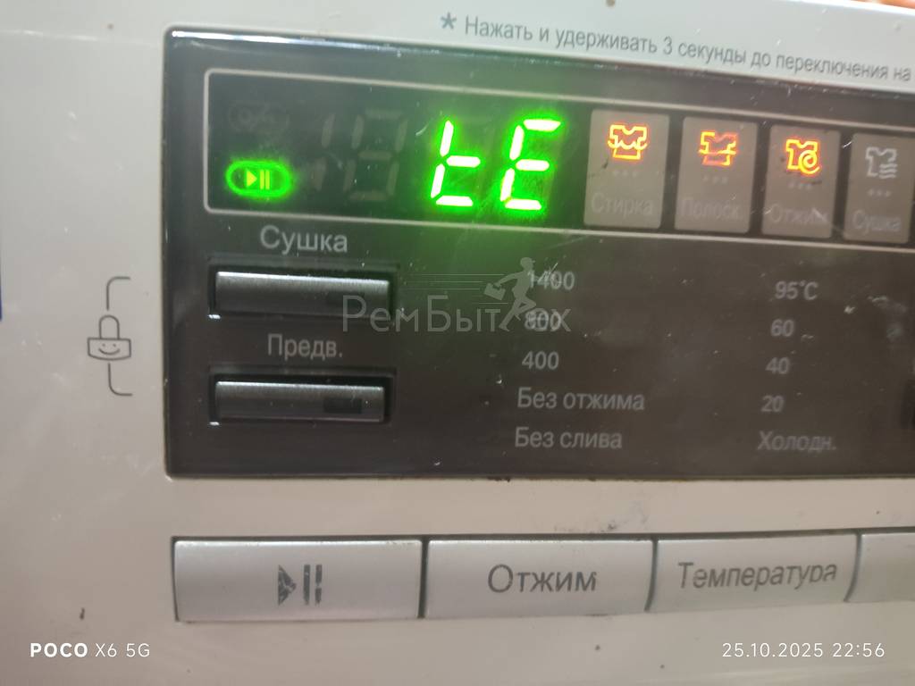 Здравствуйте. Стиральная машина Модель FH0B8ND5. При нажатии кнопки питания мигают символы (см. фото), секунды через 3-4 пропадают и появляются --- В приложении не нашел таких кодов ошибки. Что это значит и как исправить? Спасибо.
