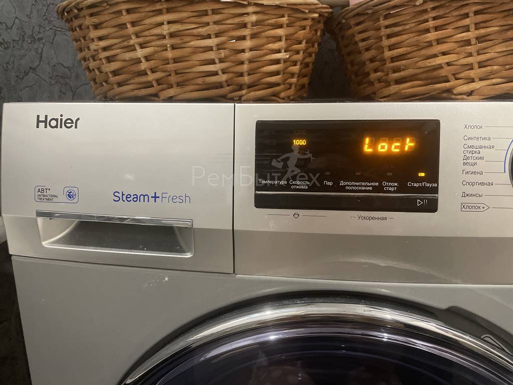Код LOCK в стиралках Haier сообщает, что включена "Защита от детей". Для отключения защиты. одновременно нажмите и держите нажатыми 3-5 сек. кнопки указанные на фото ниже: