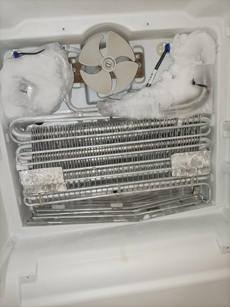 Здравствуйте! Сильно шумел вентилятор в холодильнике с NoFrost. Я вскрыл крышку, оказалось он задевал лед. Приэтом лед занимает почти все пространство вокруг вентилятора. Это нормально? Фото прилагаю.