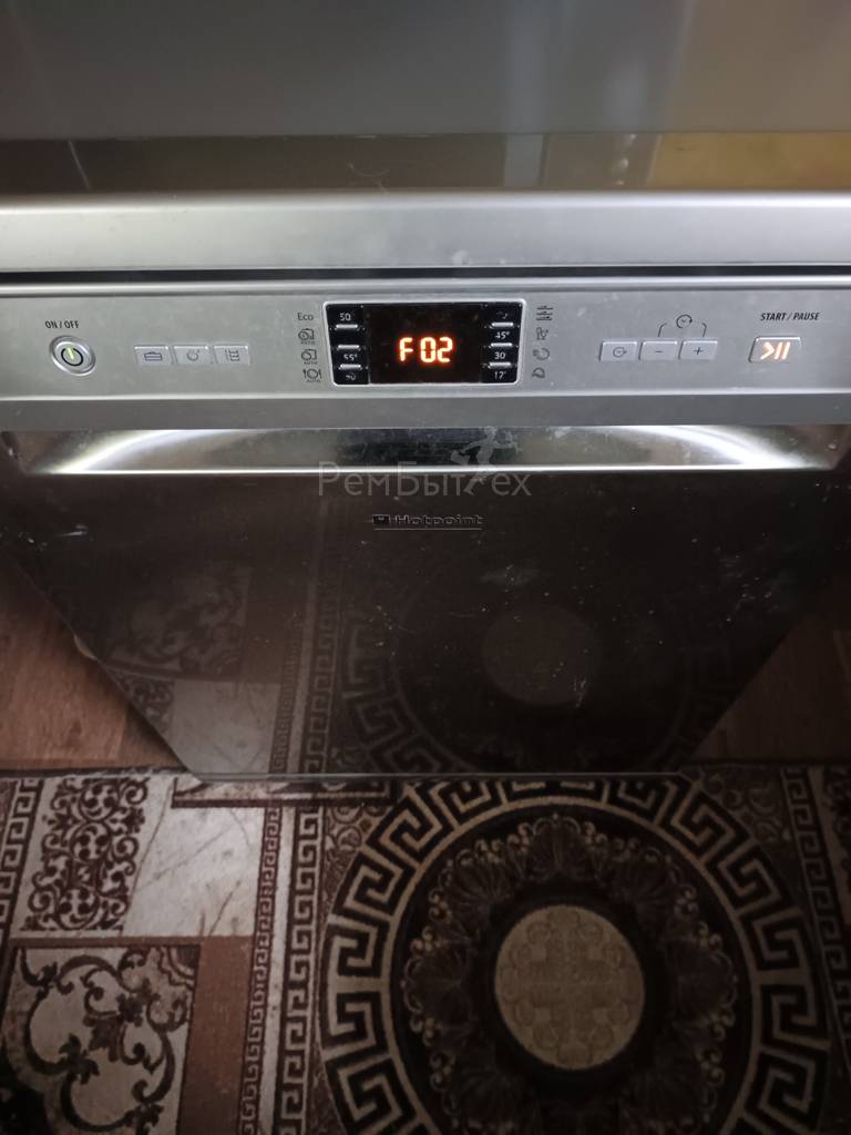 Hotpoint-Ariston LFF8S112X - отдельно стоящая посудомоечная машина, с электронным управлением на 15 комплектов посуды. Ошибка F02 сообщает что "Неисправность в электро клапане заполнения". Клапан неисправен или замыкание симистора, управляющего заливом, на плате управления. Причины: