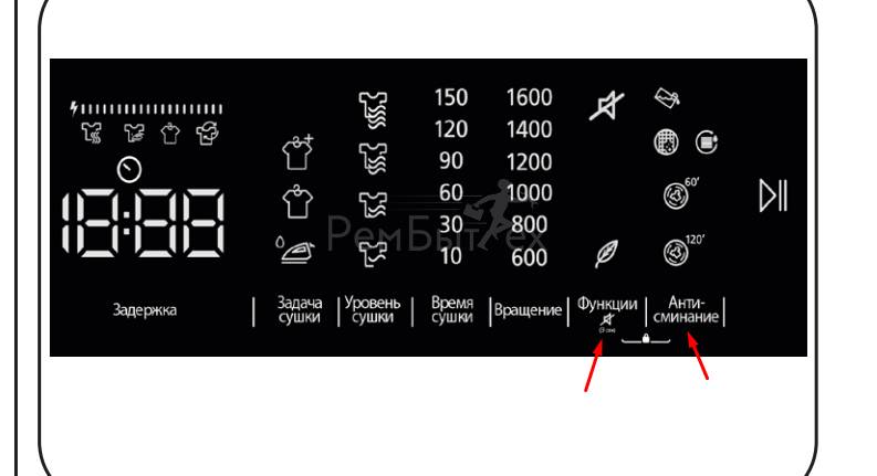 Weissgauff WD 5297 DS - отдельно стоящая сушильная машина с фронтальной загрузкой до 7 кг и электронным управлением. Для отключения Защиты от детей, необходимо одновременно нажать и держать нажатыми 3-5 сек, кнопки "Функции" и "Антисминание".