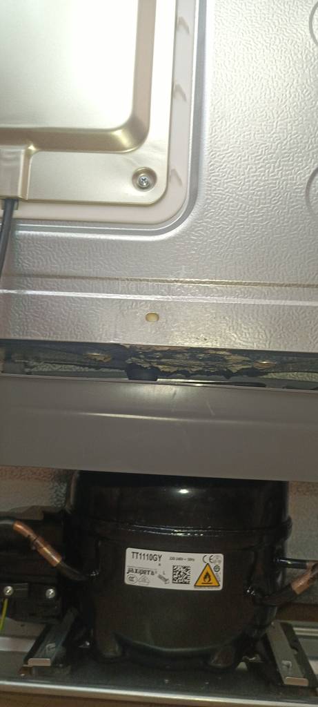 При распаковке и осмотре нового холодильника RB434N4BWE2 до включения, возле компрессора и над ним (наружнее дно морозильника) обнаружили пятна окисления. Снизу дна морозильника пятно с полладони. Что это, просто неаккуратность ,не брак? Внизу еще может быть подтеки при пайке, а днище морозильника ? Можно ли эксплуатировать и не повлияет ли исправной работе холодильника в дальнейшем?