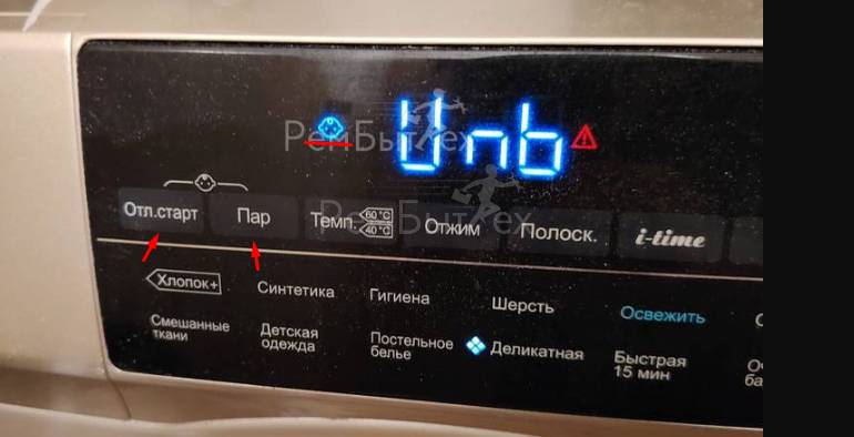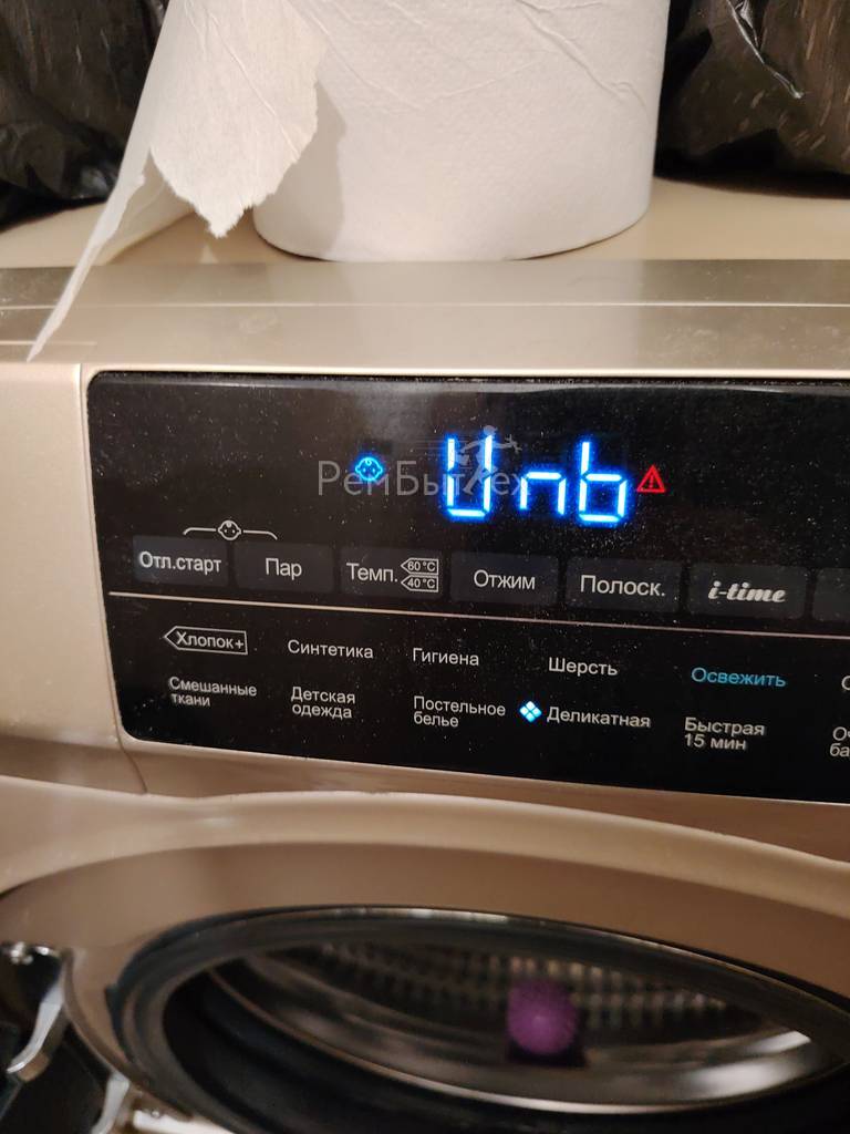 Код Unb на дисплее стиральной машины Haier носит информационный характер и означает, что машинка на отжиме не смогла равномерно разложить бельё в барабане. Поэтому отжим так и не начался.