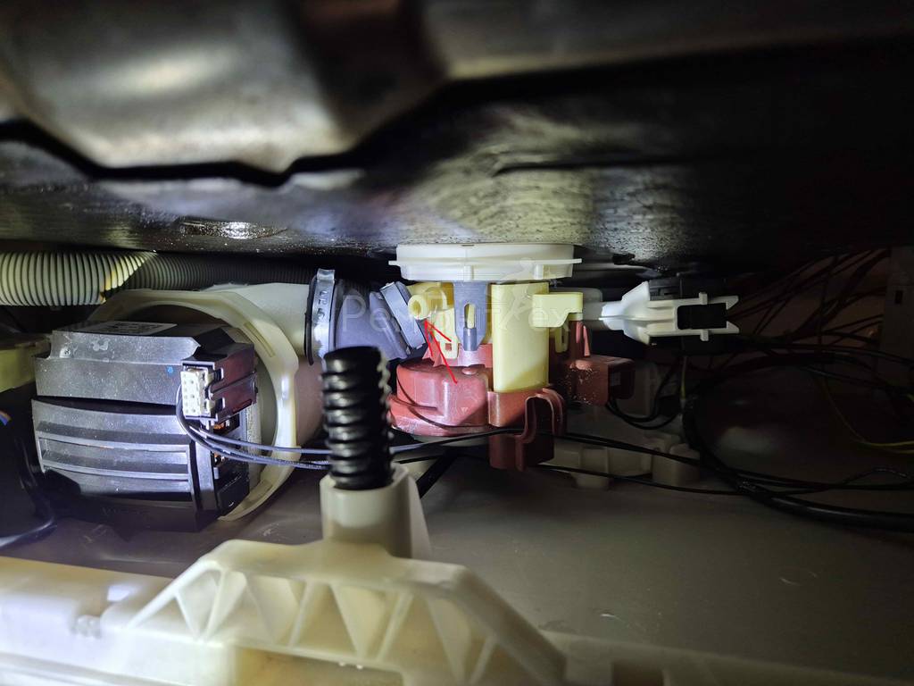 Вячеслав 17 мар. 20262Посудомоечная машина Gorenje GV661C60. При работе вода вытекает из показанного красной стрелкой места под нижними разбрызгивателями (см фото). Течет довольно сильно, срабатывает аксастоп и ошибка F54. Подскажите, что это?