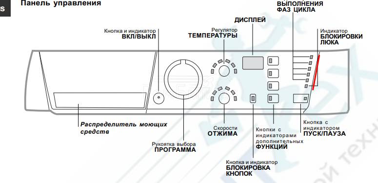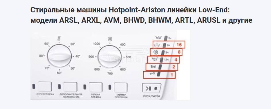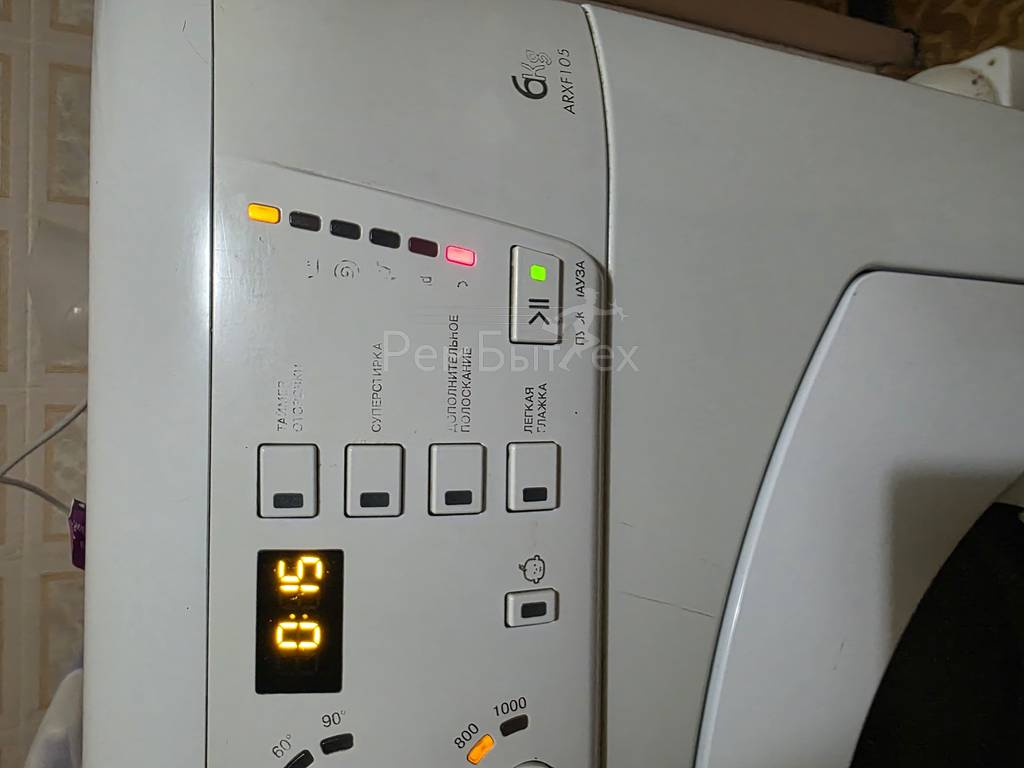 Hotpoint-Ariston ARXF 105 - отдельно стоящая стиральная машина с фронтальной загрузкой до 6 кг и электронным управлением, оборотами отжима до 1000 оборотов. Мы не поняли, что за 6-й индикатор справа. В этих машинках, ошибку указывают следующие индикаторы, (фото ниже).