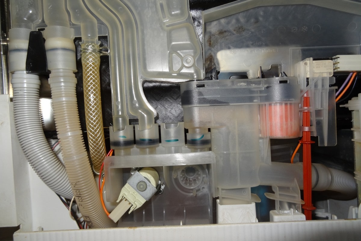 Кроме насосов в тракте залива, циркуляции и слива воды есть специальные емкости (бачок для соли, со смолой, канистра-теплообменник), заливной клапан, другие узлы, соединяющиеся патрубками и шлангами. По мере эксплуатации посудомойки хомуты, скрепляющие соединения, слабеют, в результате образуется течь.